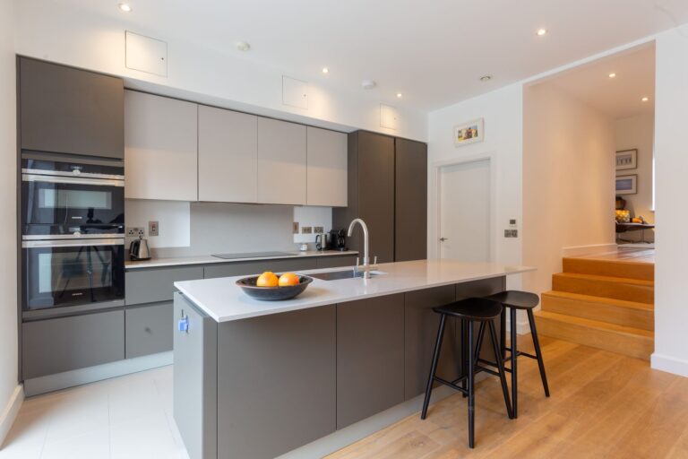 o Kitchen island to each kitchen with dishwasher and sink unit 20mm stone. worktops with integrated drainers and under mounted stainless steel sinks with matching stone splashbacks.